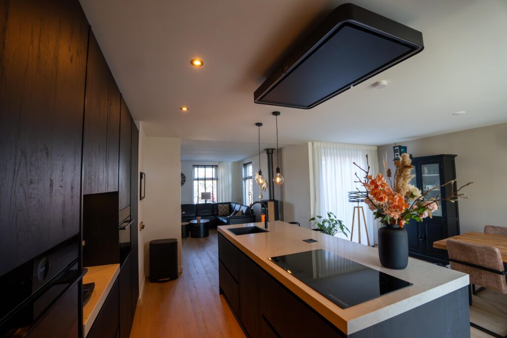 De NOVY Cloud 230 plafondunit (110 cm, zwart) met randafzuiging en recirculatie zorgt voor een schone en frisse keuken. De geïntegreerde LED-verlichting creëert daarnaast een warme sfeer, ideaal voor zowel koken als gezelligheid.