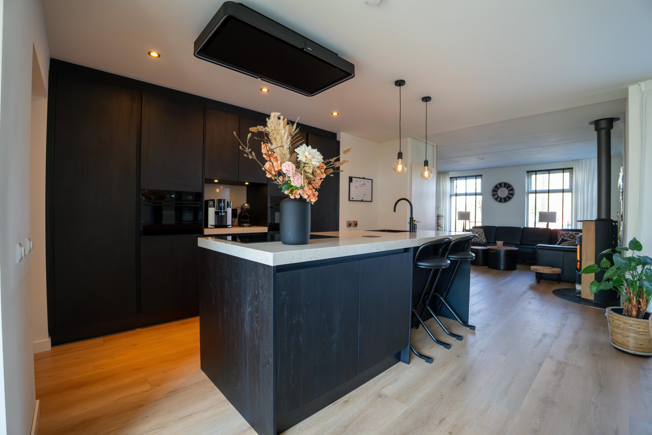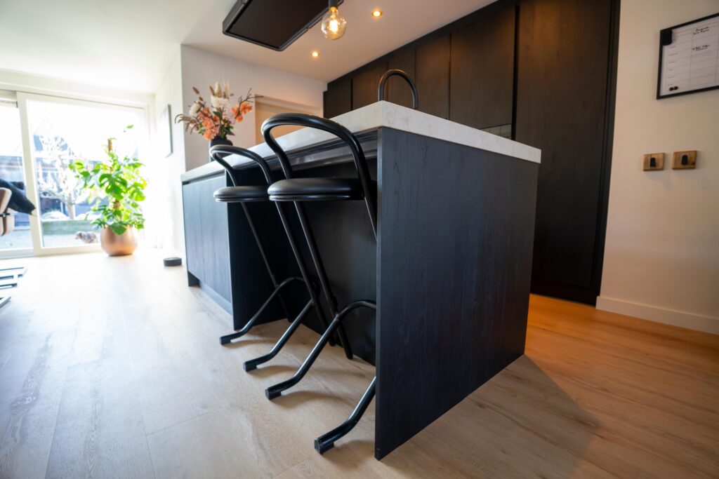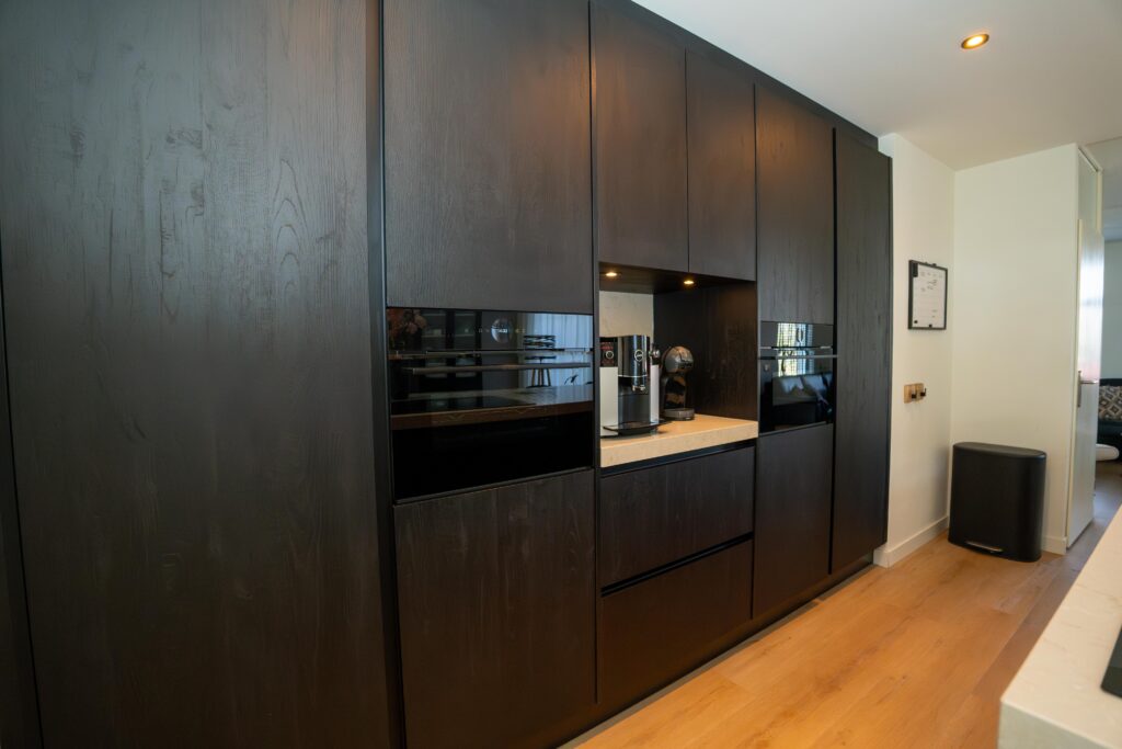 De Cleaf Sherwood fronten in de kleur Nero, met hun verticale houtnerf, brengen natuurlijke schoonheid in de ruimte. De strakke zwarte Softlak greeplijst voegt een moderne flair toe, passend bij het eigentijdse design.