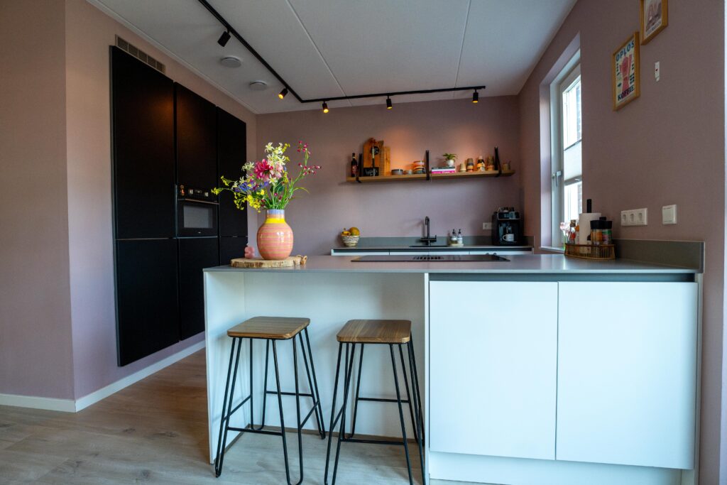 De bewoners hebben slimme kleurkeuzes gemaakt die de keuken laten leven. De frisse, verfijnde tinten op de wanden zorgen voor een lichte en luchtige uitstraling, terwijl de speelse inrichting een gezellige sfeer creëert. Het is duidelijk een plek waar je je snel thuis voelt.