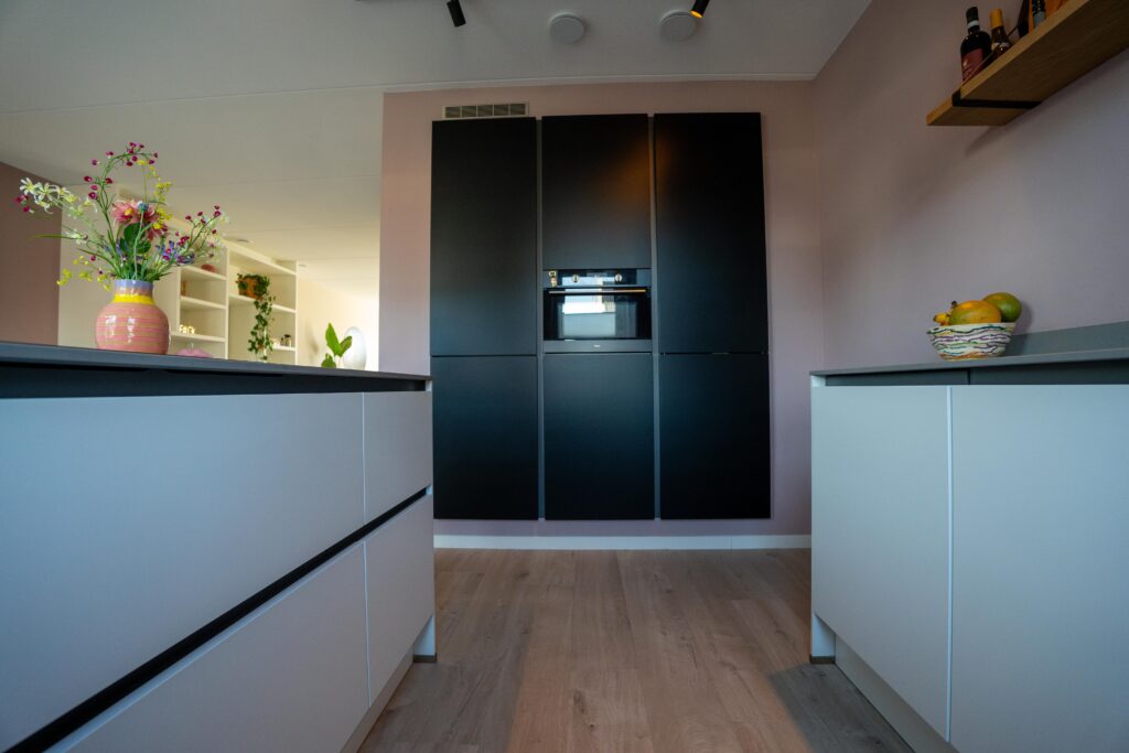 De keuken heeft een strak, greeploos design in twee kleuren. Het schiereiland en de spoelbak zijn uitgevoerd in wit softmat, wat niet alleen modern oogt, maar ook makkelijk schoon blijft. De kastwand in zwart softmat vormt een mooi contrast en maakt de ruimte extra stijlvol.