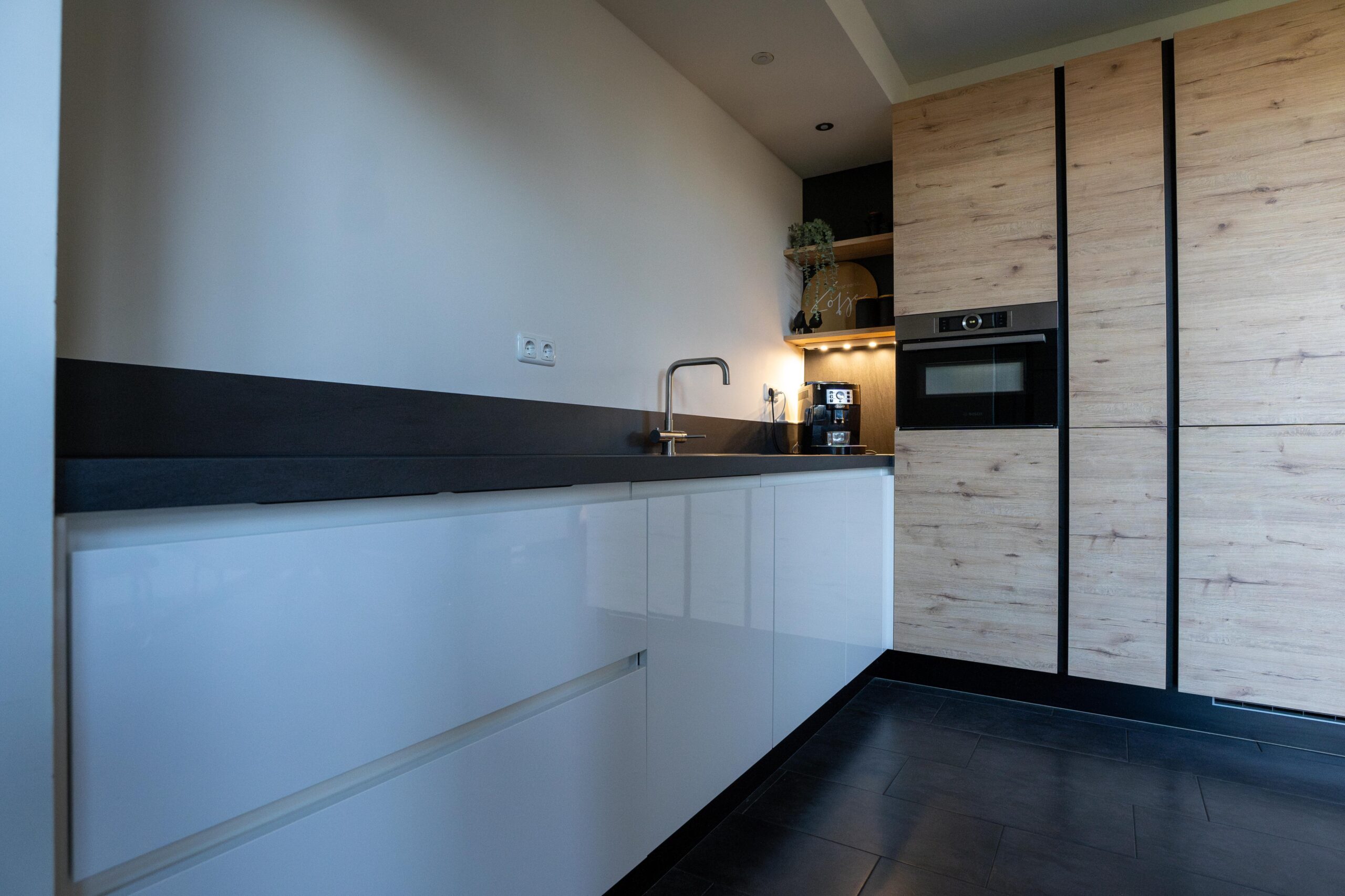 In het hart van hun woning straalt een keuken die tijdloos design en moderne functionaliteit moeiteloos combineert. De tweekleurige uitvoering zorgt voor een warme en stijlvolle uitstraling. De lage kasten in laklimaat wit hoogglans geven een frisse en lichte basis, terwijl de hoge kasten in wildeiken een natuurlijk contrast en een vleugje warmte toevoegen.