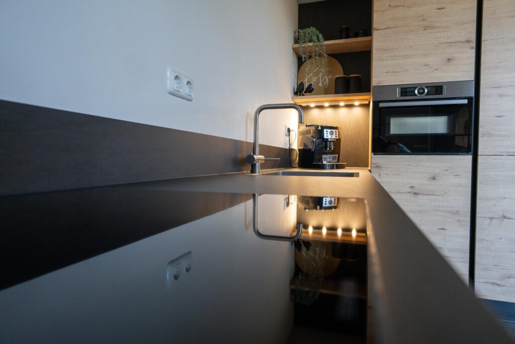 Het keramieken werkblad van 47 mm dik is niet alleen een stevige en elegante basis, maar ook een slimme keuze. Dit materiaal is hittebestendig, krasvrij en onderhoudsvriendelijk – ideaal voor een keuken waarin zowel schoonheid als gebruiksgemak telt.
